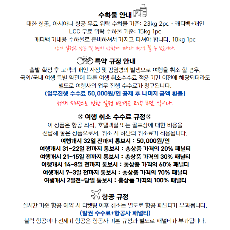 ์ 2์กฐ. ์ทจ์ ์์ฝ๊ธ ๊ท์ (์ ์ ๊ธ ๋ฐ ๊ณ์ฝ๊ธ ๋ณ๋) - ์ถ๋ฐ์ผ๊ธฐ์ค 30์ผ์ ์ทจ์์ ์ํํ๋งค๊ฐ์ 10% ์ทจ์์์ฝ๊ธ ๋ฐฐ์ - ์ถ๋ฐ์ผ๊ธฐ์ค 29 ~ 21์ผ์ ์ทจ์์ ์ํํ๋งค๊ฐ์ 20% ์ทจ์์์ฝ๊ธ ๋ฐฐ์ - ์ถ๋ฐ์ผ๊ธฐ์ค 20 ~ 15์ผ์ ์ทจ์์ ์ํํ๋งค๊ฐ์ 30% ์ทจ์์์ฝ๊ธ ๋ฐฐ์ - ์ถ๋ฐ์ผ๊ธฐ์ค 13 ~ 2์ผ์ ์ทจ์์ ์ํํ๋งค๊ฐ์ 50% ์ทจ์์์ฝ๊ธ ๋ฐฐ์ - ์ถ๋ฐ์ผ๊ธฐ์ค 1 ~ ๋น์ผ ์ทจ์์ ์ํํ๋งค๊ฐ์ 100% ์ทจ์ ์์ฝ๊ธ |