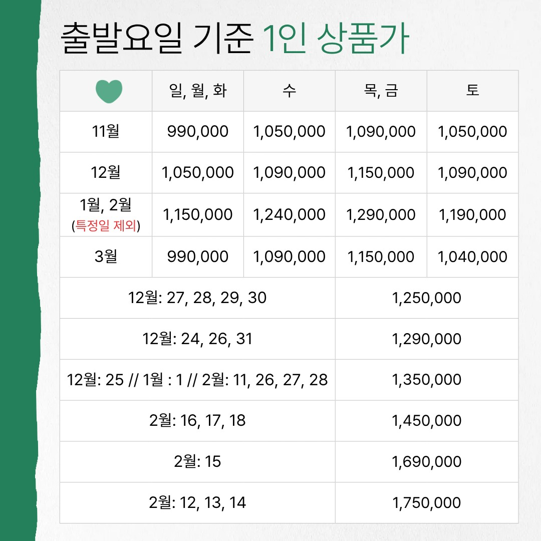 기타사항 - 여권이 있으신 분은 여권에 기재된 정확한 영문이름을 알려주세요. - 여권 기간만료일을 확인하시어, 출발일로부터 최소 6개월 이상 남아 있어야 합니다. - 예약 후 3일 이내에 1인 총금액의 10 ~ 20%를 계약금을 입금하셔야 예약이 확정됩니다. - 예약금은 상품별로 상이 하므로 자세한 사항은 문의 바랍니다. - 주류담배 면세허용범위는 담배 1보루(200개피) 또는 250g 시가, 주류 1리터입니다. |