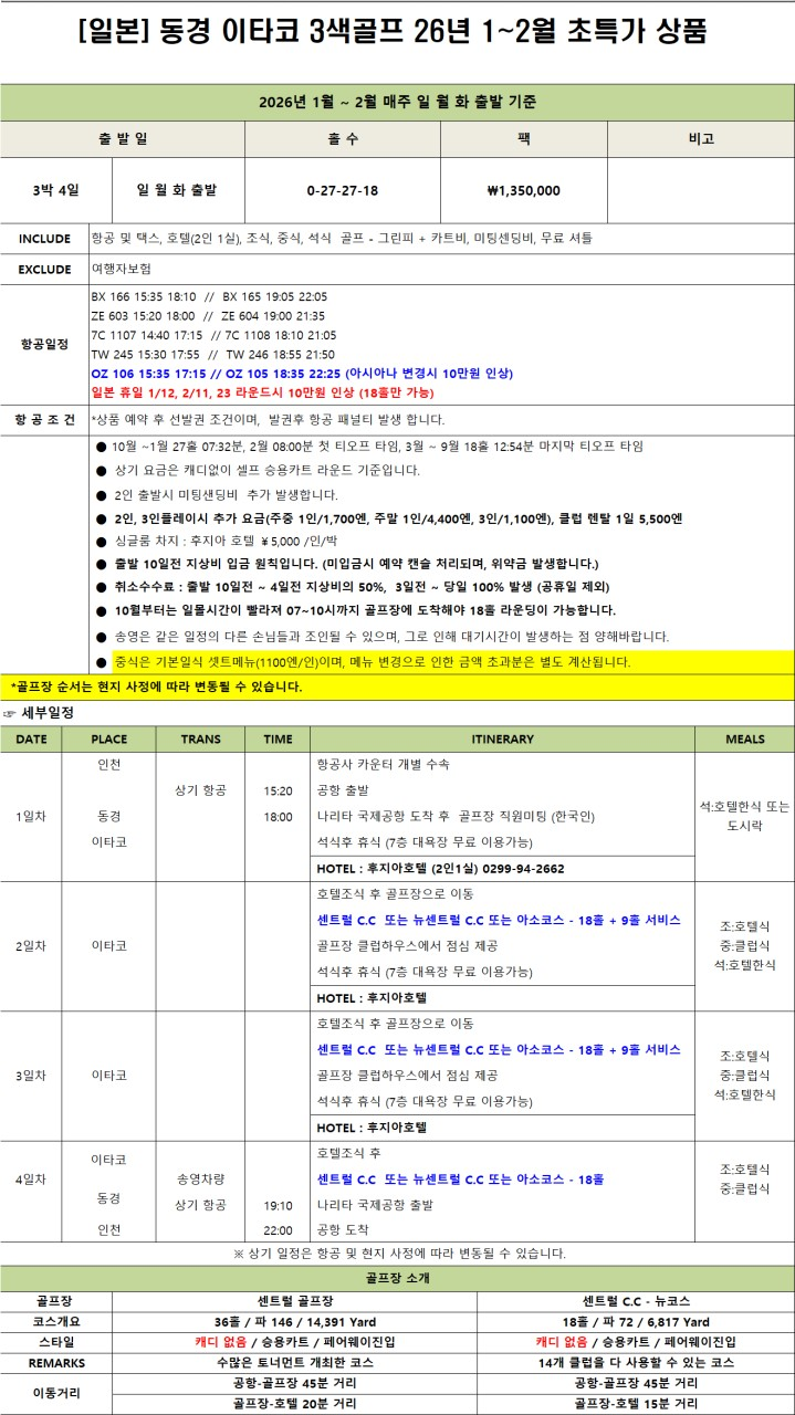 1월 2월 동경 이타코 3색 특가 패키지