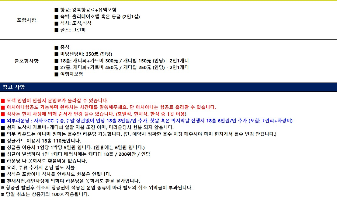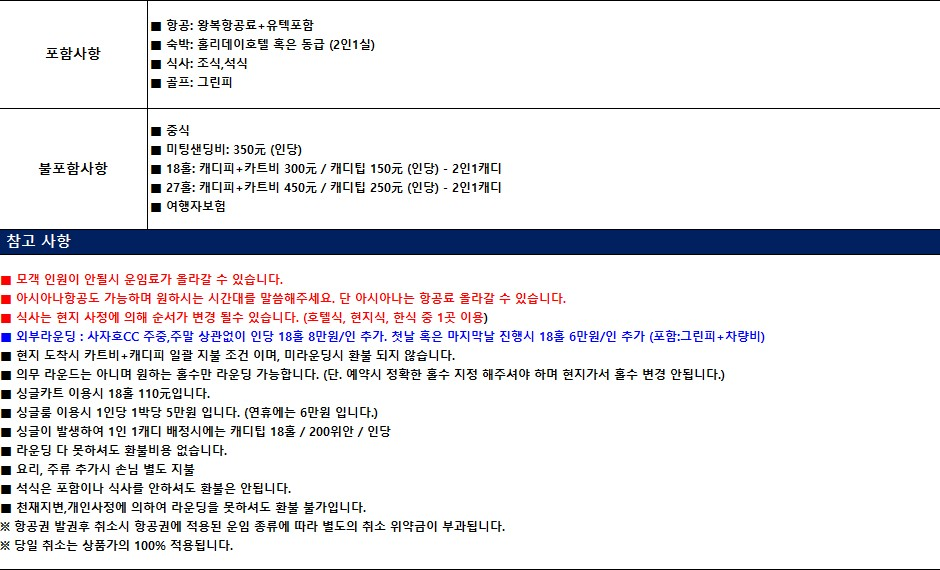 ■ 현지 도착시 카트비+캐디피 일괄 지불 조건 이며, 미라운딩시 환불 되지 않습니다.