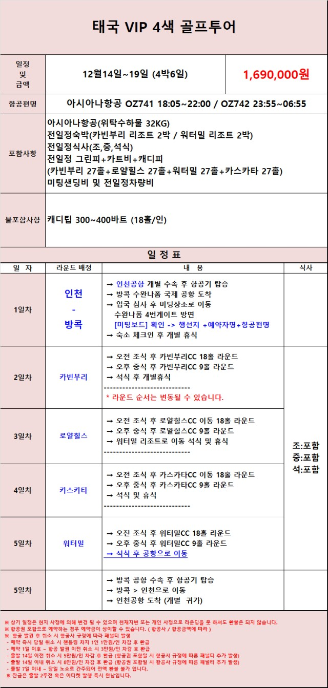 입금안내 1인당 계약금 **만원씩을 아래 구좌로 입금하여 주십시요. 담당자 확인 후 -> 계약금 입금 후 모든 예약이 진행됩니다. 잔금은 최소 출발 2주 전까지 입금하여 주십시요. 입금계좌 : 기업은행 080-087935-01-021 ㈜타이가골프 |
