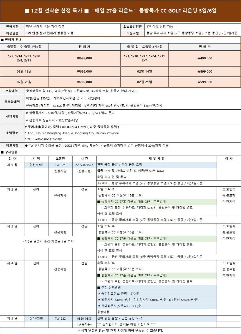 TW산야 동방목가CC 매일 27홀 라운드 5일/6일