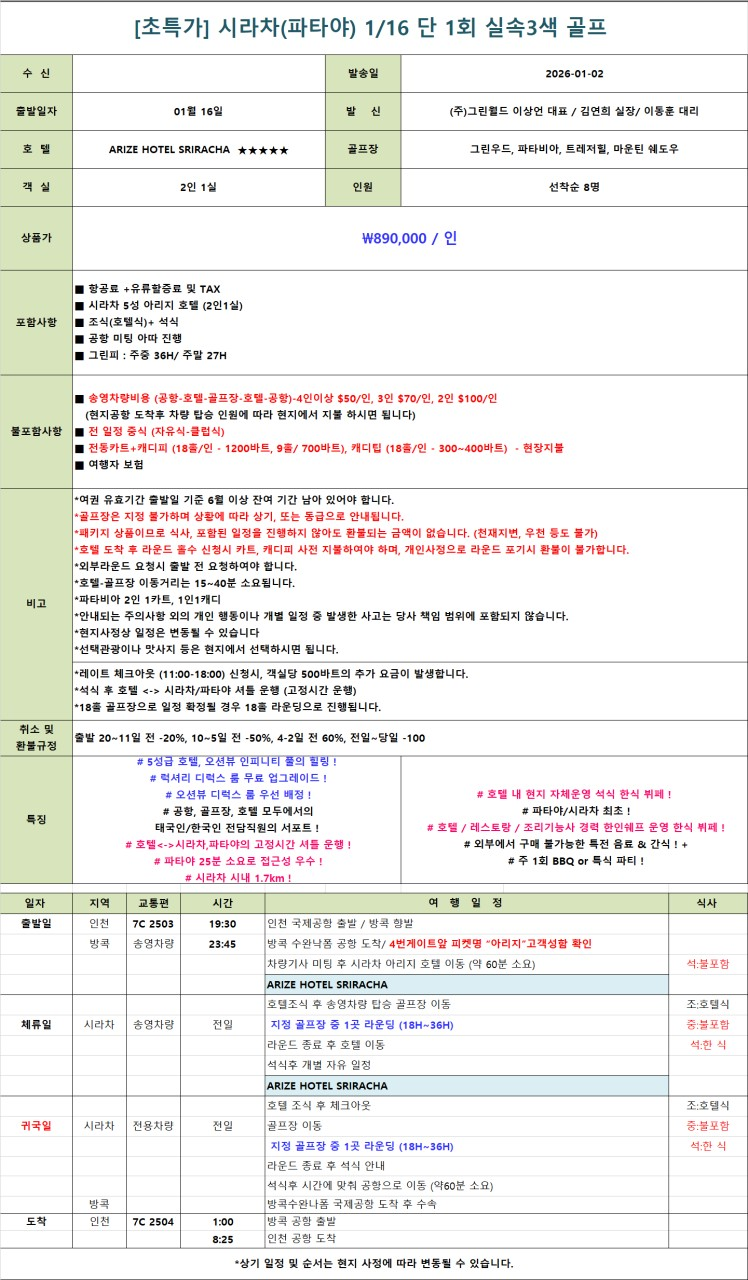 입금안내 1인당 계약금 **만원씩을 아래 구좌로 입금하여 주십시요. 담당자 확인 후 -> 계약금 입금 후 모든 예약이 진행됩니다. 잔금은 최소 출발 2주 전까지 입금하여 주십시요. 입금계좌 : 기업은행 080-087935-01-021 ㈜타이가골프 |