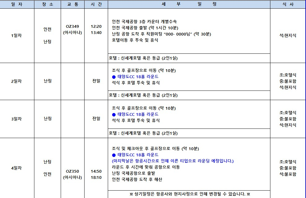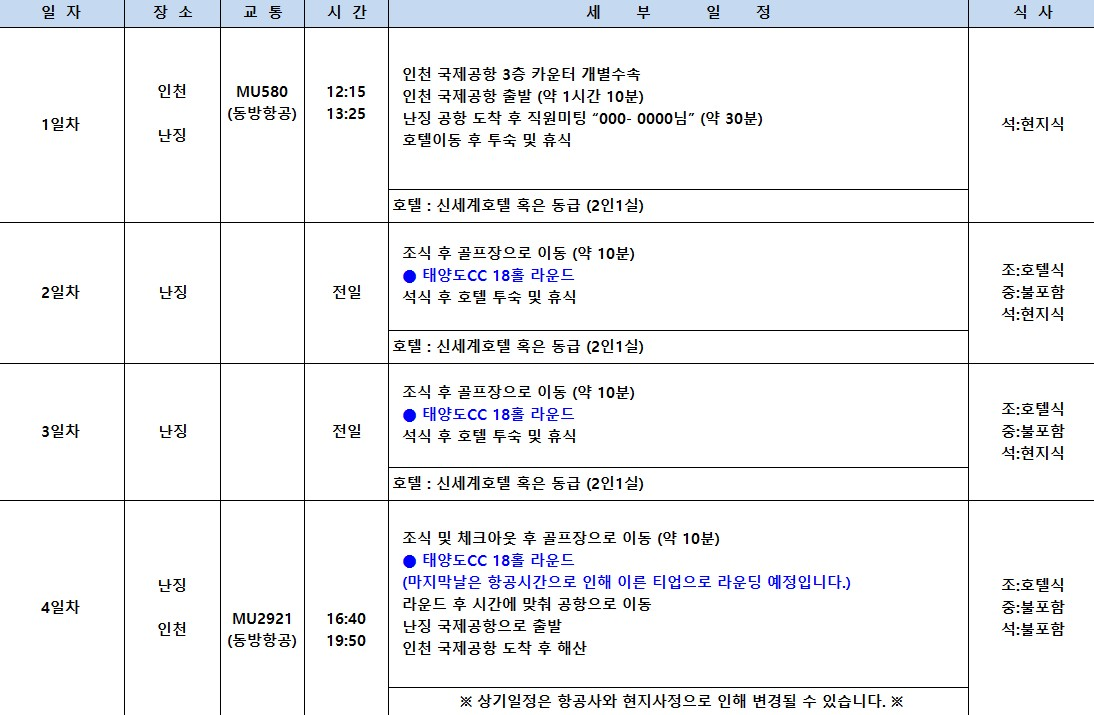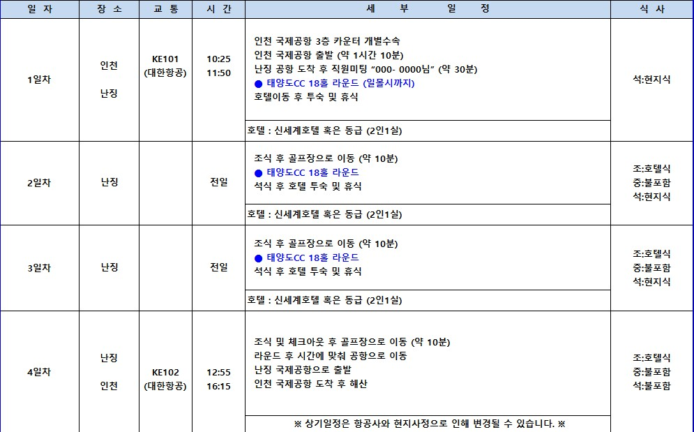 난징 태양도CC 중식+팁외 올포함⛳5성급호텔과 구글 평점 4.5인 태양도cc 💥3박4일 동방항공 1,120,000원 아시아나 1,170,000원, 대한항공1,210,000원BESTMD