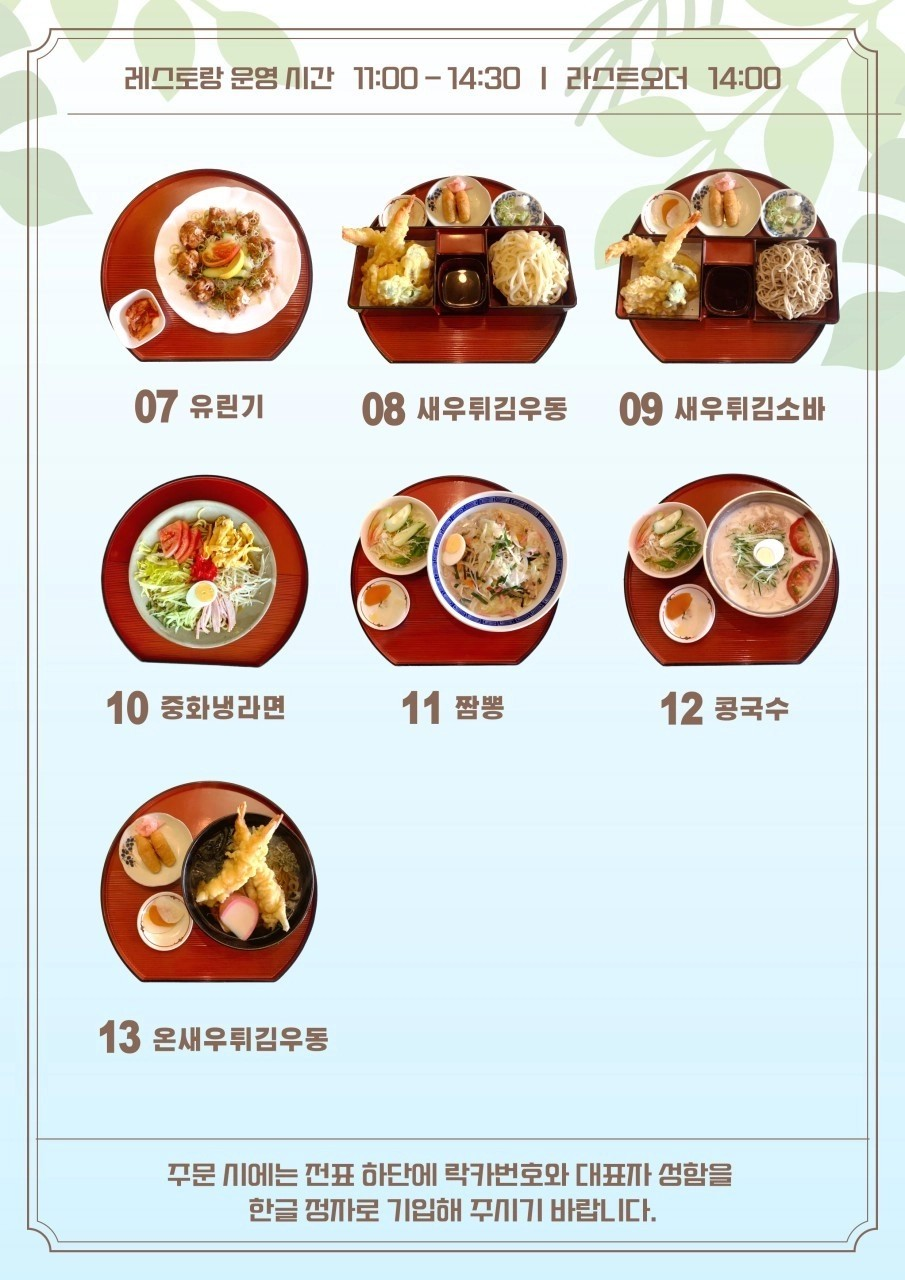 집밥처럼 깔끔한 국물 요리를 중심으로 한국인 입맛에 맞게끔 제공됩니다.