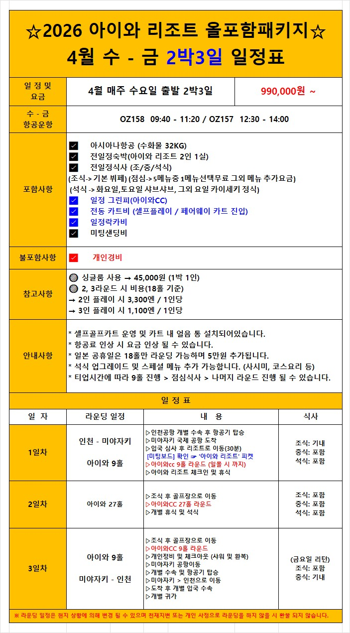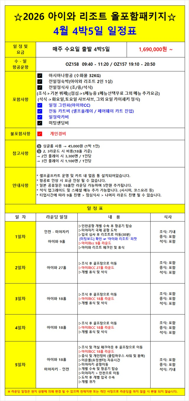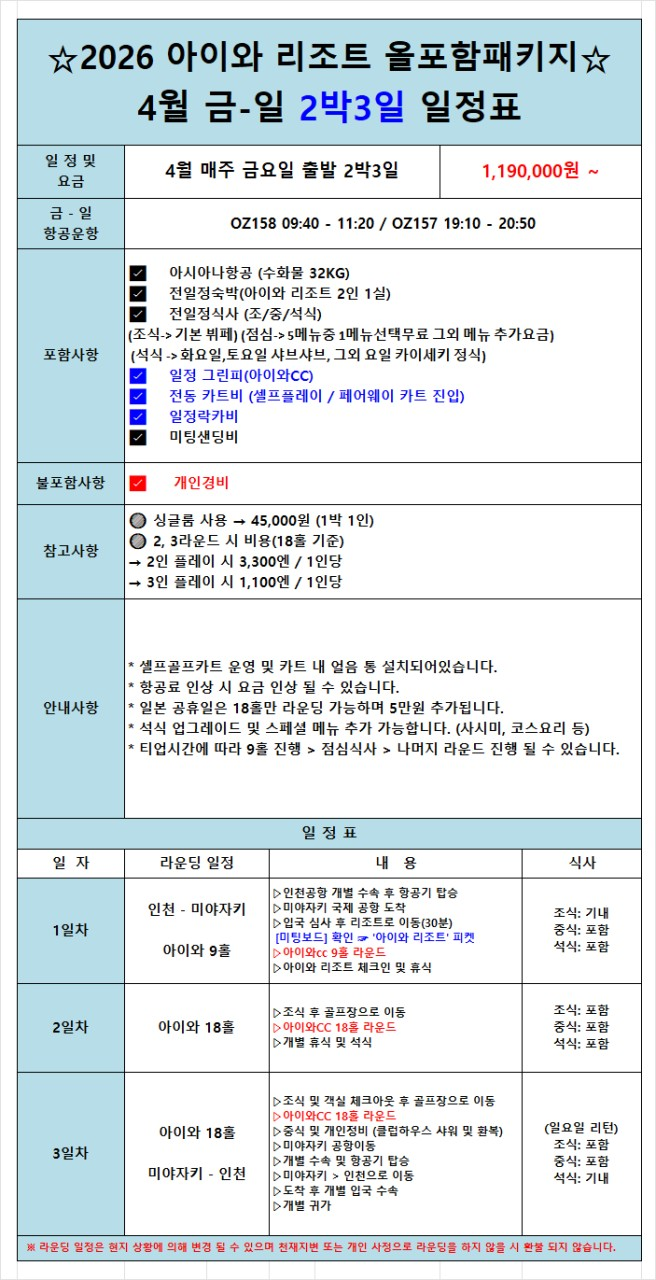 4월⛳️ 미야자키, 아이와CC ⛳️올포함 패키지 2박3일 990,000원~ 3박4일 1,090,000원~BESTMD