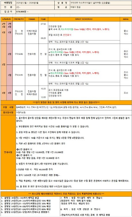 입금안내 1인당 계약금 **만원씩을 아래 구좌로 입금하여 주십시요. 담당자 확인 후 -> 계약금 입금 후 모든 예약이 진행됩니다. 잔금은 최소 출발 2주 전까지 입금하여 주십시요. 입금계좌 : 기업은행 080-087935-01-021 ㈜타이가골프 |