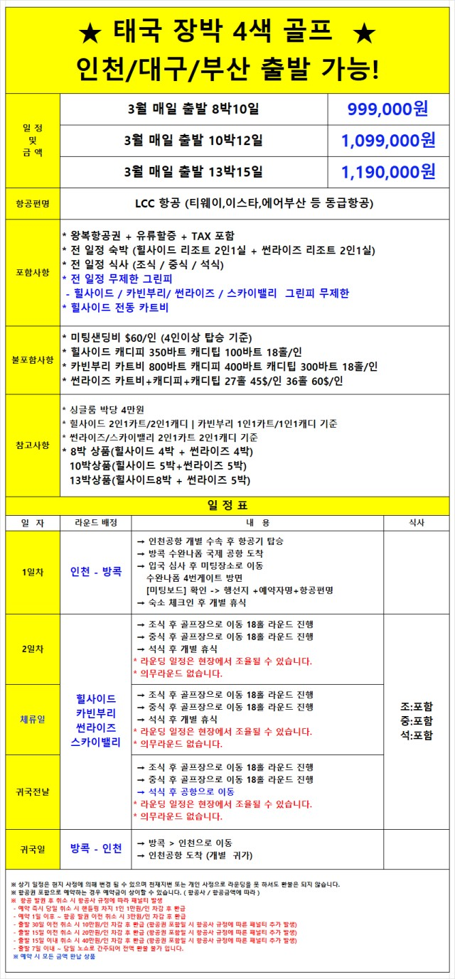태국 방콕+카오야이골⛳️힐사이드+카빈부리+썬라이즈+스카이밸리⛳️8박10일 999,000원 10박12일 1,090,000원 ✨️4개 골프장이 만났다.72홀을 내마음대로~~BESTMD