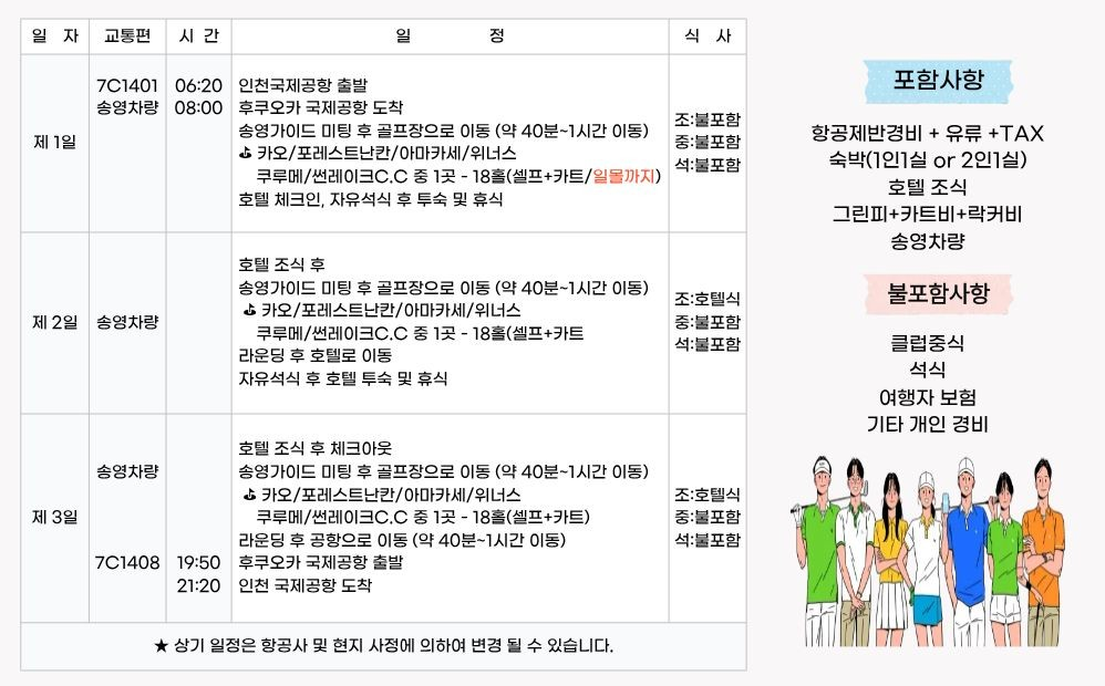 항공제반경비, 숙박(1인1실 or 2인1실), 호텔 조식, 그린피/카트비/락커비, 송영차량,여행자보험