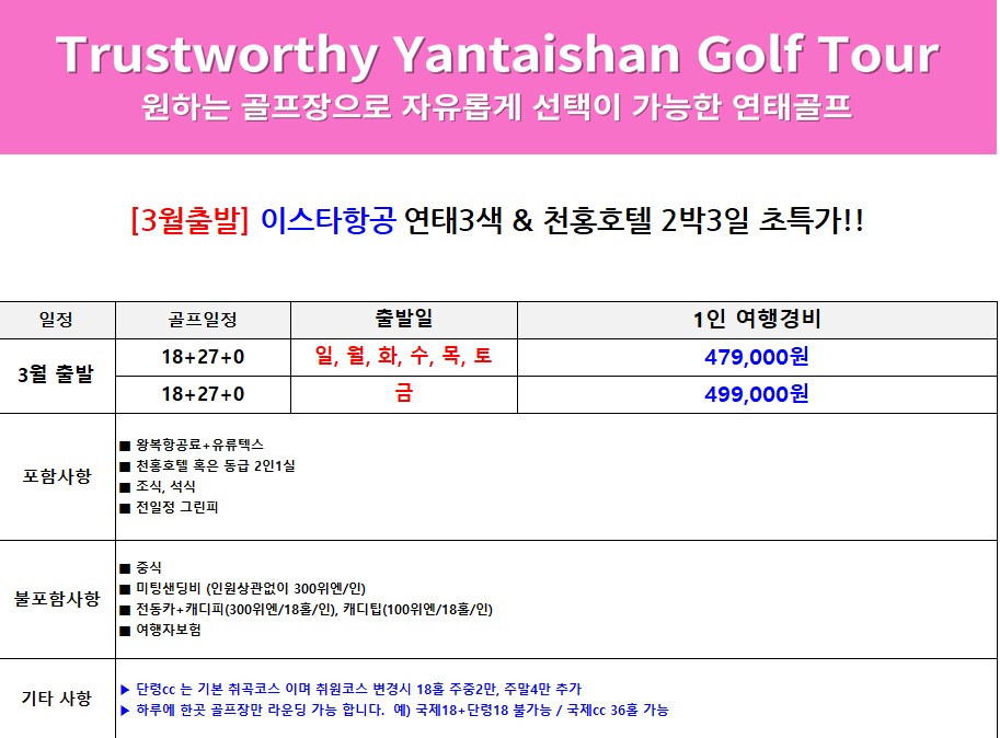 [3~4월 출발] 연태3색+천홍호텔 2박3일 초특가! (18+27+0홀) 479,000원~