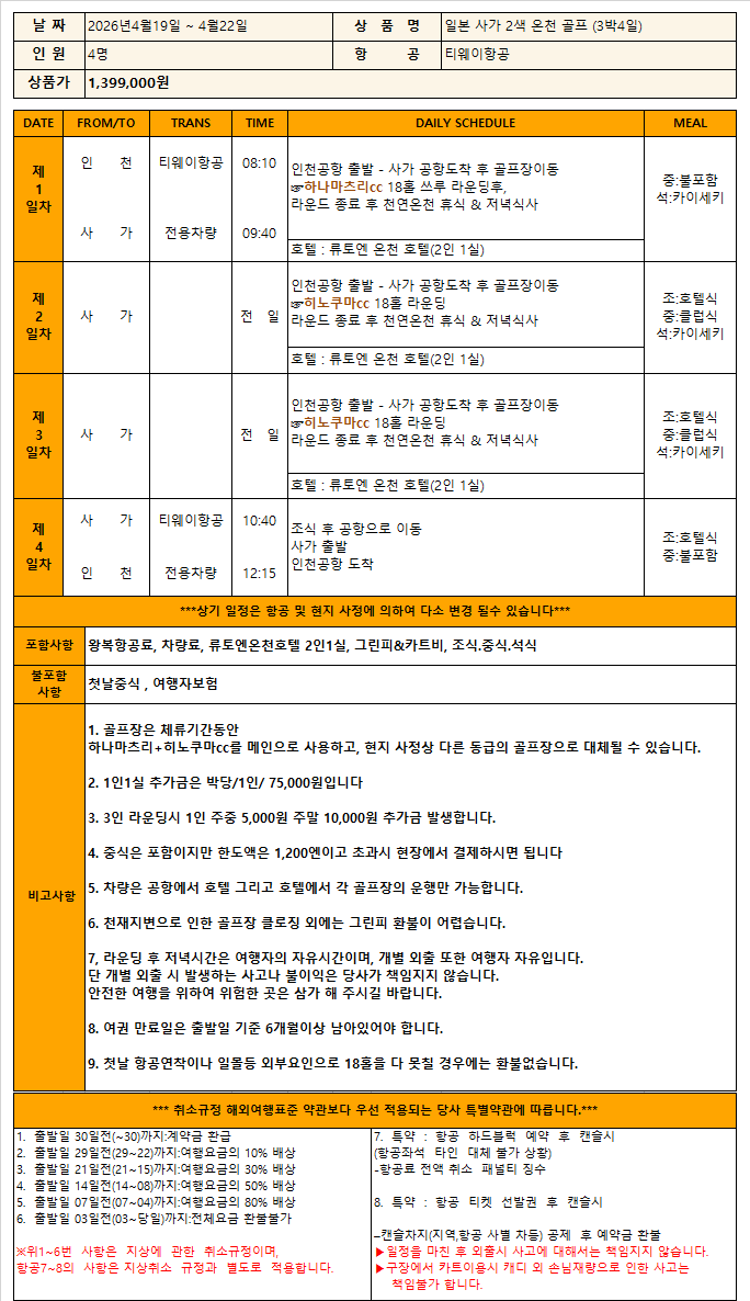 1️⃣골프장은 체류 기간동안 하나마츠리cc와 히노쿠마cc를 메인으로 사용하고 현지 사정상 다른 동급의 골프장으로 대체될 수 있습니다.