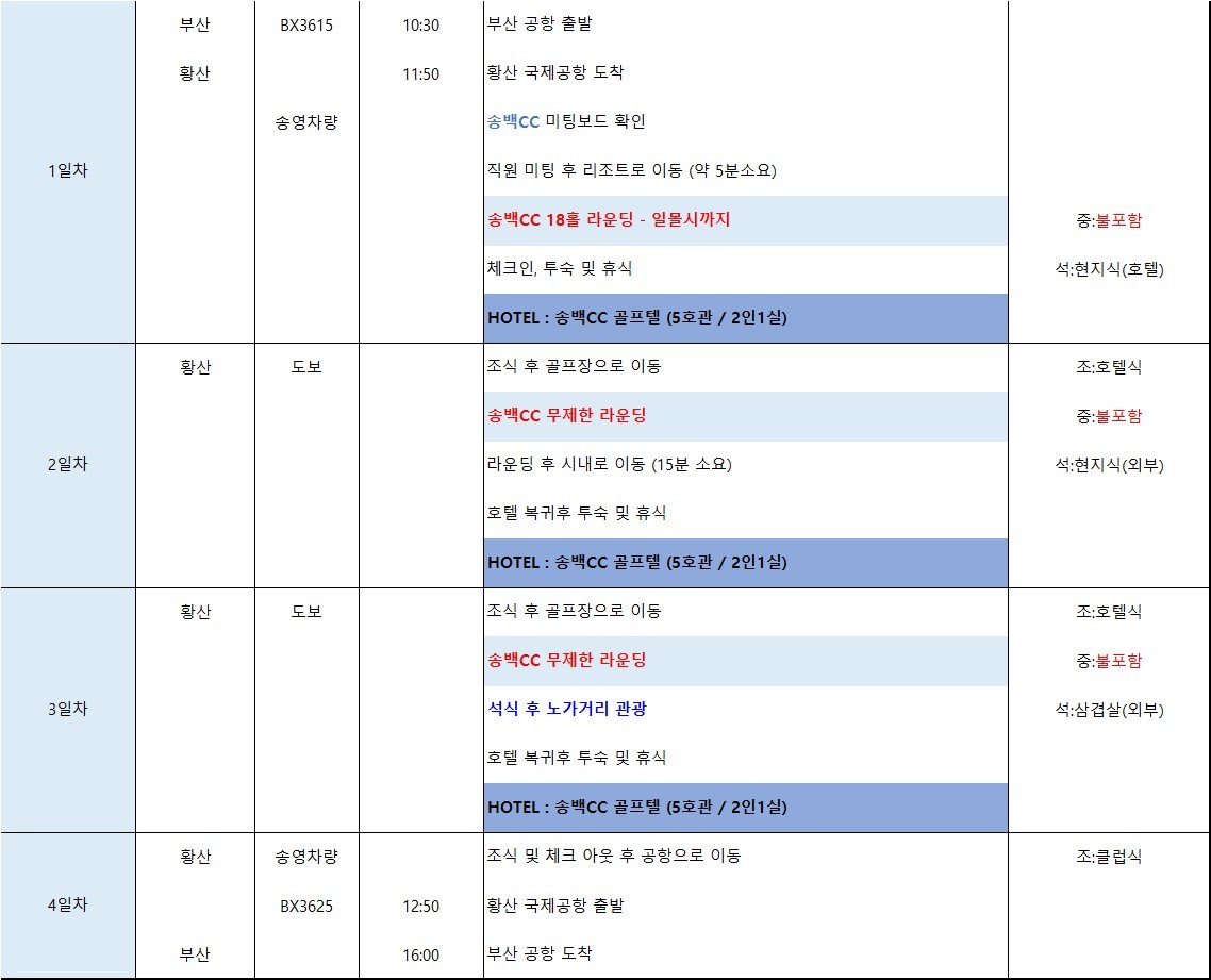 📍왕복 항공료, 클럽 중식, 카트비+캐디피 , 캐디팁, 미팅&샌딩비(현지지불), 기타 개인경비, 여행자 보험 불포함 입니다.