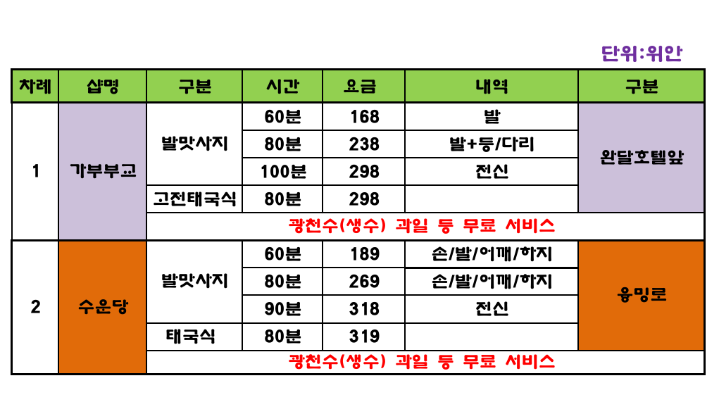 - 발마사지 60분/168위안, 80분 240위안, 전신 100분 300위안, 태국식 80분 300위안내외