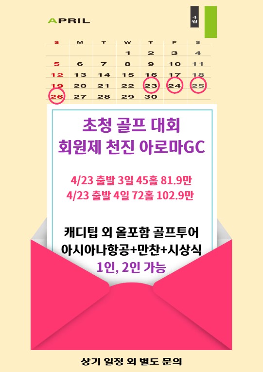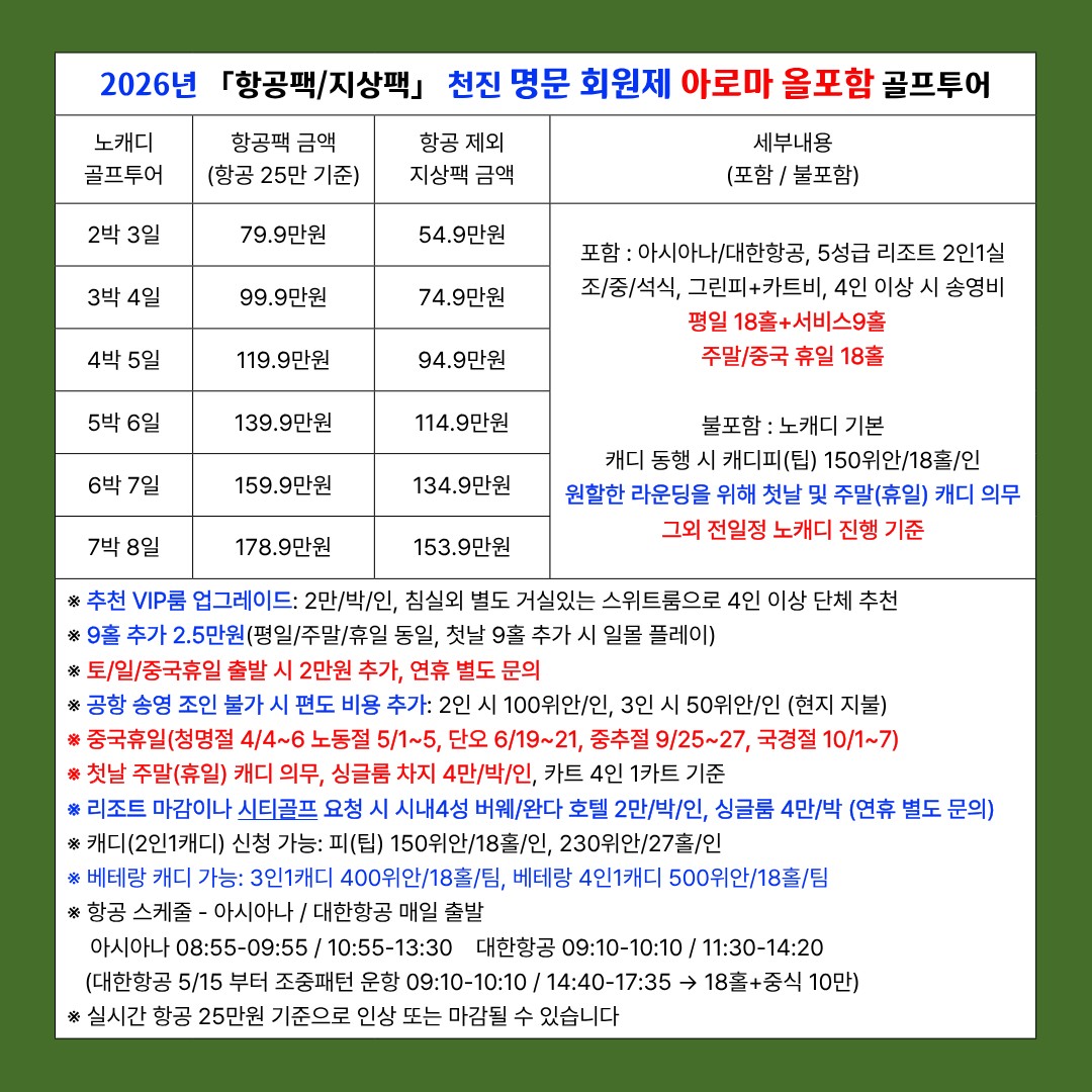 ⛳ 아시아나 항공과 함께하는 회원제 천진 아로마 초청 골프 대회 4/23~ 2박3일 819,000원~ // 3박4일 1,029,000원~