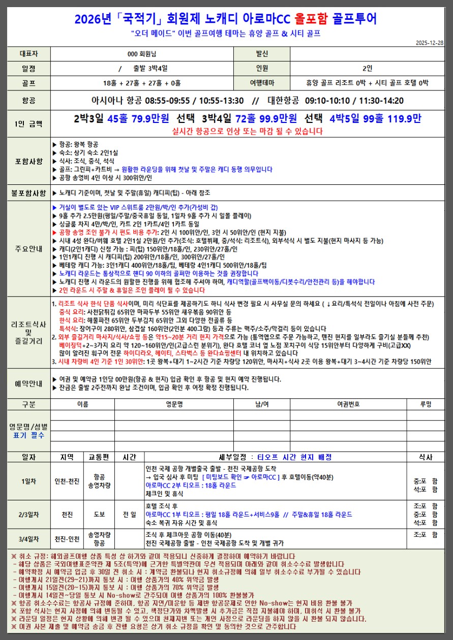4/23 출발 3박4일 18+27+27+0홀 총 72홀 1,029,000원~