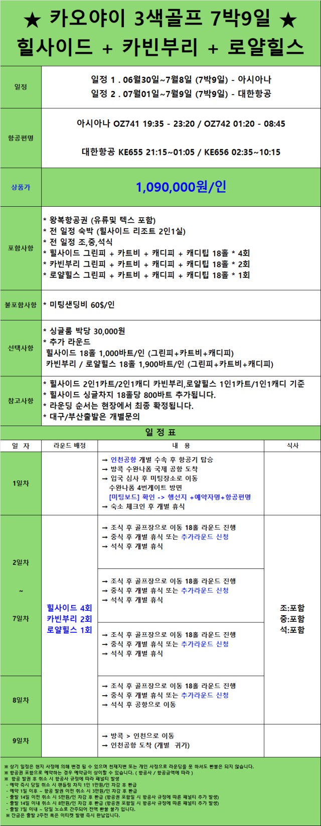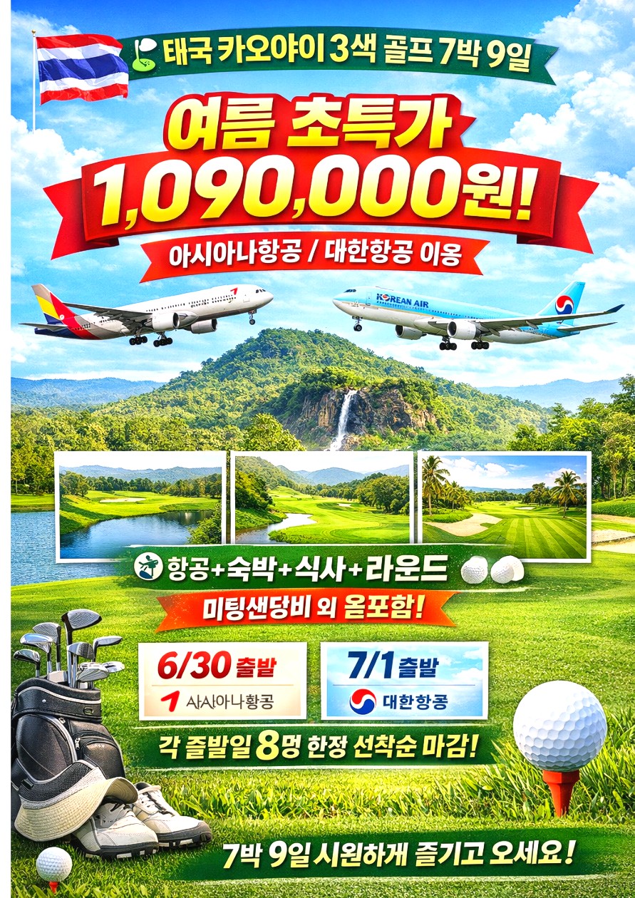 6~7월⛳ 태국 카오야이 3색 골프 7박 9일 올포함 특가! 1,090,000원 💎지정일특가 OZ,KE항공 샌딩비외 올포함