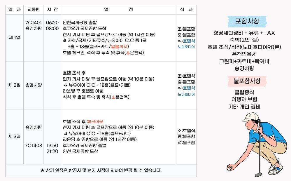 항공제반경비, 호텔비(2인 1실), 호텔 조/석식(90분 노미호다이), 그린피, 카트비, 락카피, 호텔-골프장 송영차량비용,여행자보험