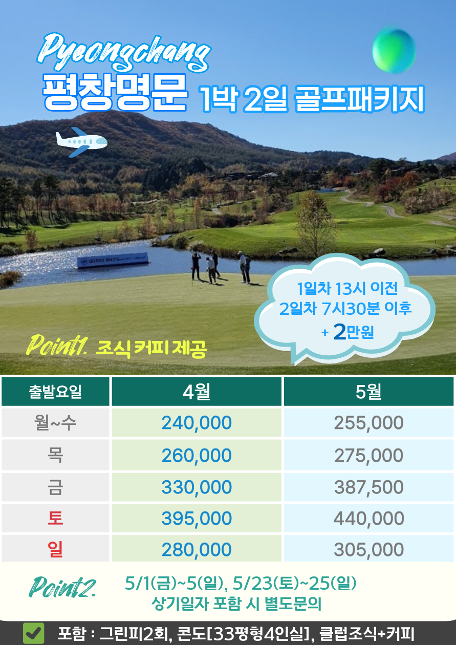4~5월⛳강원 평창 명문(평창) 1박2일 36홀 240,000원~ 🔊대관령 청정 세계적인 명품 골프코스 평창 명문!! "평창 명문" 골프여행!!